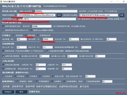 一.MALHJ助手专业同花顺版主要定制:(避免每次运行软件都得重新修改输入) 1.绑定自己的QMT帐号 2.设定同花顺路径,如:D:\同花顺XX版\mx_999XXX\stockblock.ini 3.设定QMTmini路径文件夹,如: E:\某某证券QMT交易端\userdata_mini 4.设定监控的动态和我的板块名称:自选1,一进二,打板等 (一旦选好了动态板块,只需在同花顺改名字,马上自动下单) 5.可以设守固定交易模式的固定金额(也可以自由设置) 如图红色部份: 图片:991.JPG 二.MALHJ助手专业通达信版主要定制:(避免每次运行软件都得重新修改输入) 1.绑定自己的QMT帐号 2.设定预警文件路径,如:D:\malhj.txt 3.设定QMTmini路径文件夹,如: E:\某某证券QMT交易端\userdata_mini 4.绑定自己想自动买卖的具体预警名称:一进二,打板,买入,打首板等 (对于符合预警名称一致的预警进行快速自动交易) 5.可以设守固定交易模式的固定金额(也可以自由设置) 如图红色部份: 图片:992.JPG 定制费用详情: http://www.malhj.com/read-217.html 还没有达到量化交易的,只是想用MALHJ专业版系列排序公式 详情:http://www.malhj.com/read-201.html 想更多了解MALHJ量化助手专业版的粉丝可加 微信号:w1968131366(非诚勿扰,不喜勿加) 手机微信同号:15907742318(非诚勿扰,不喜勿加) 。 或者扫码加好友