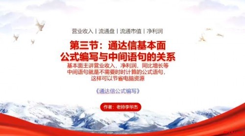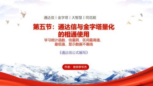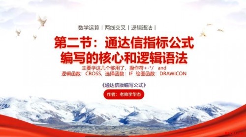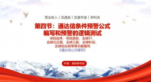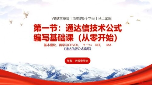 (一):零基础学会通达信公式编写 第一节:通达信技术公式编写基础课(从零开始)。 内容简介:只需熟记26字中的五个字母CHVOL就可以编写出自己的第一主图公式。 第二节:通达信指标公式编写的核心和逻辑语法。 内容简介:学会加减乘除和修饰上色及画图就可以编写出丰富多彩的主图公式了。 第三节:通达信基本面公式编写与中间语句的关系。 内容简介:学会把基本面数据显示在主图上,同时学会多头金叉三角稳定信号写法实践,涨停K线上色提示等编写 第四节:通达信条件预警公式编写和预警的逻辑测试。 内容简介:学会编写条件选股《首板打法》《一进二高开》等公式进行选股和预警 第五节:通达信与金字塔量化的相通使用。 内容简介:学会编写《涨停倍量阴战法》《N天内出现涨停》等条件公式及选股修饰方法。 【一】学习与参加方式(非诚勿扰) 内部在线回放输入密码参与学习和下载学习公式资料。 参加学习前请认真阅读【风险揭示书】,参加即代表您完全认可协议 新老粉丝统一价格:136元/节,总计680元 所以参与的新老粉丝可以获得: 1.赠送MALHJ通用版系列公式一份价值368元 2.赠送现成的《三角金叉》《涨停首板》《一进二高开》《涨停倍量阴》选股公式,支持所有通达信版,支持券商版等 省吃一次大餐就可学到无价的知识,有舍有得,师傅领进门,造化提升在个人。想参加学习的粉丝朋友们,请老帅李华杰的微信,注明学习公式编写 微信号:w1968131366(非诚勿扰,不喜勿加) 手机微信同号:15907742318(非诚勿扰,不喜勿加) 。 或者扫码加好友